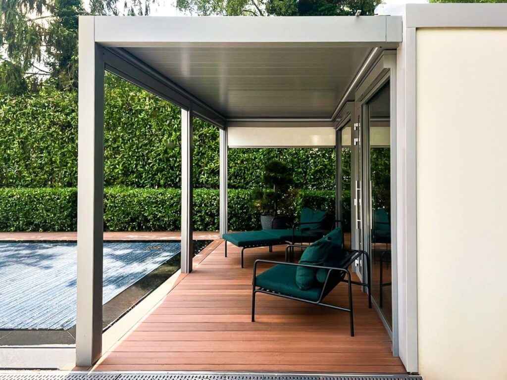 Outdoor-Komfort auf Knopfdruck – Lamellen regulieren Licht & Wetter. Integrierte Beleuchtung & Beschattung möglich.
